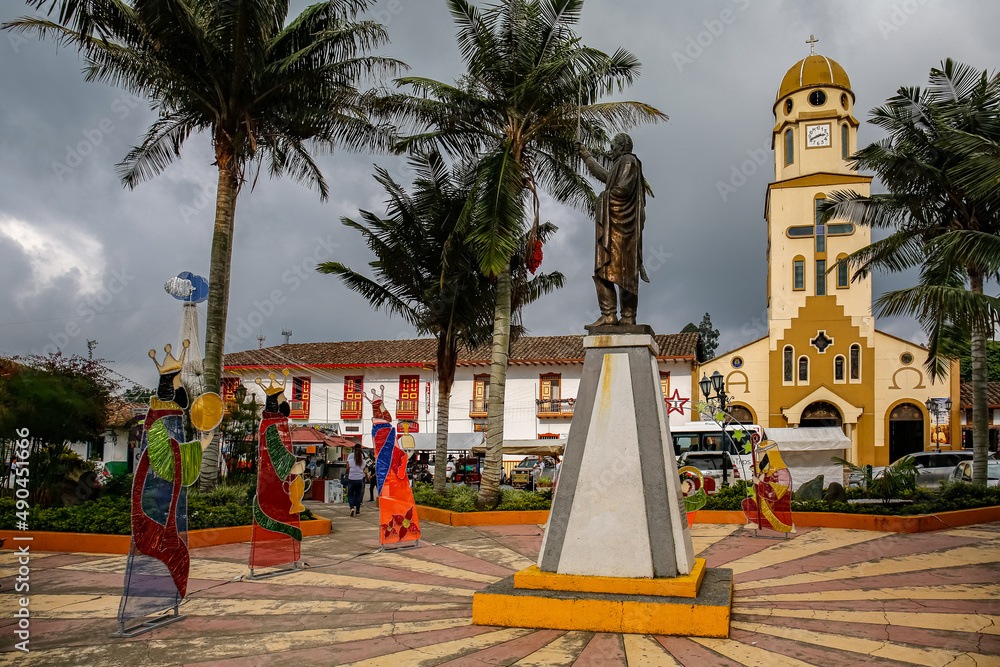 Bolivar Square Salento with statue and church Our Lady of Carmen with dark clouds in background, Cocora Valley, Columbia