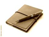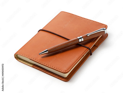 A leather notebook and pen set against a white background.