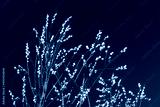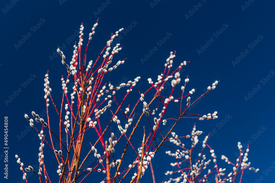 Beautiful pussy willow flowering branches with fluffy catkins and blue sky.