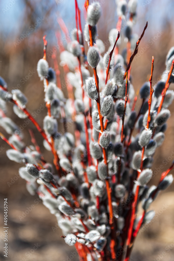 Beautiful flowering pussy willow bunch with fluffy catkins in sunny spring day.