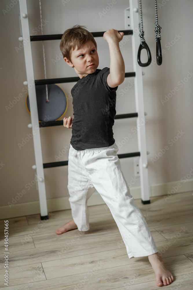 cute caucasian karate boy standing in stance in white kimono pants and black tee shirt at home near wall bars.