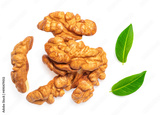Walnut Isolated. Walnut kernel Nuts with green leaves on white background. Top view. Flat lay.