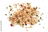 Oatflakes with Nuts, seeds and dried fruits isolated on white background. Granola Flat lay. Top view.