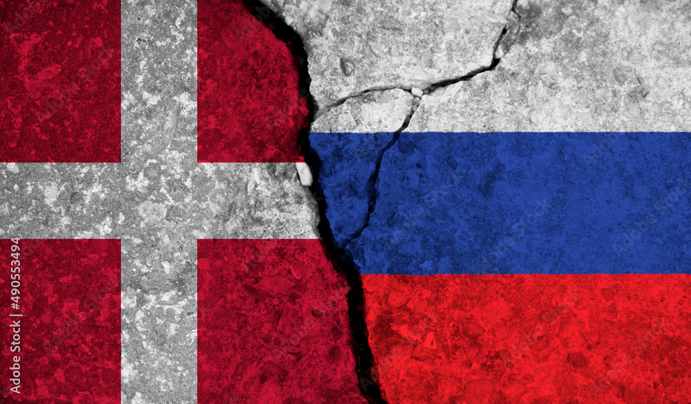 Political relationship between Denmark and russia. National flags on cracked concrete background