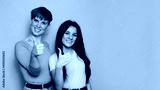 A studio shot of two young girl friends on a bright background shows an approving hand sign. A place for your text.