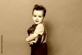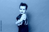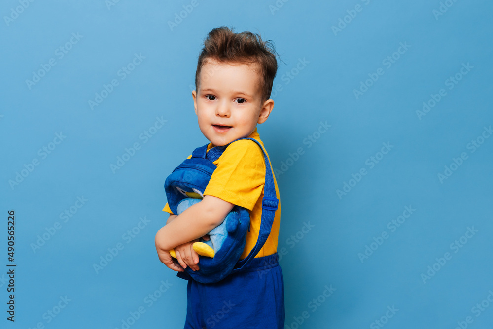 Cute little one cuddles with his backpack on a blue background. Funny kid