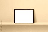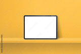 Digital tablet pc on yellow wall shelf. Horizontal background banner