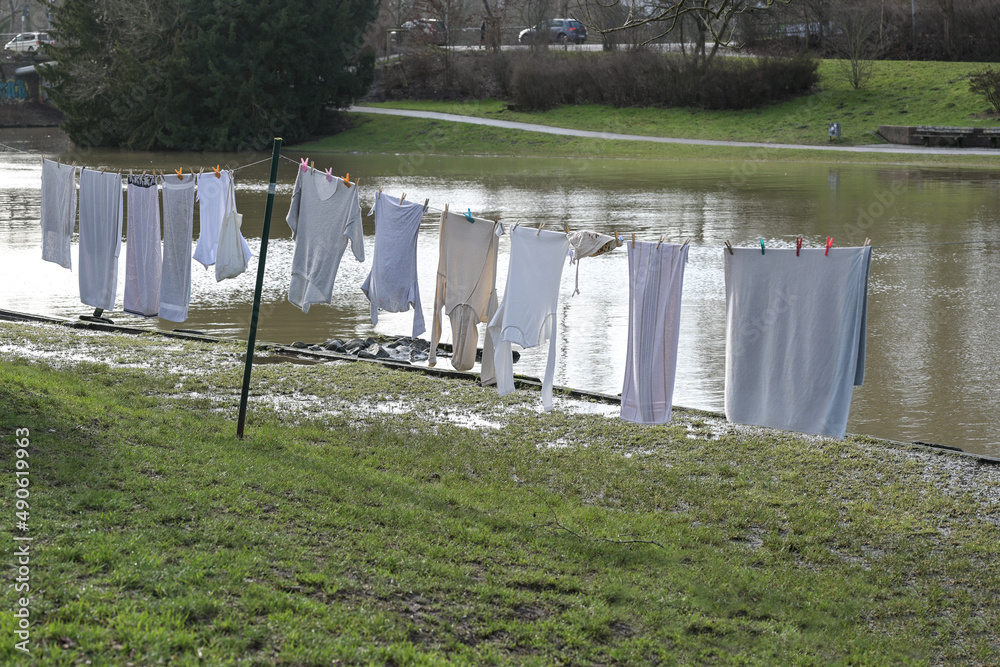 Hanging laundry on the banks of the river Trave in the old town of the Hanseatic city of Lubeck, Germany, copy space, selected focus