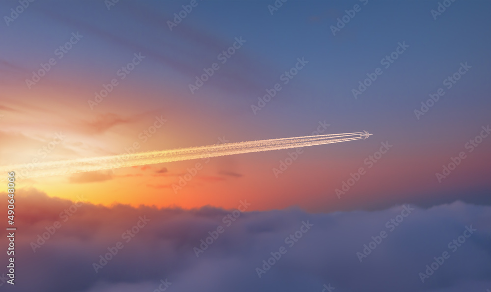 Jet airplane with trail of fuel on blue sky