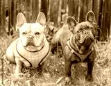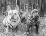 Red tan (left) and blue Isabella (right) Frenchie buddies. Off-leash dog park in Northern California.