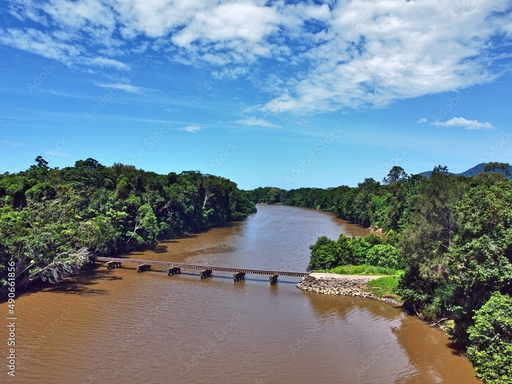 Drone shot of a railway track bridge across a brown water river at Far North Queensland.