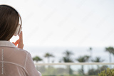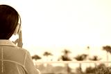 Rear view of woman with headphones looking on palm trees sea beach at sunset. Female relaxing listenning music.