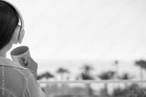 Rear view of woman with headphones and cup of coffee looking on palm trees sea beach at sunrise morning. Female relaxing listenning music.