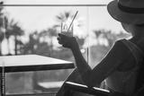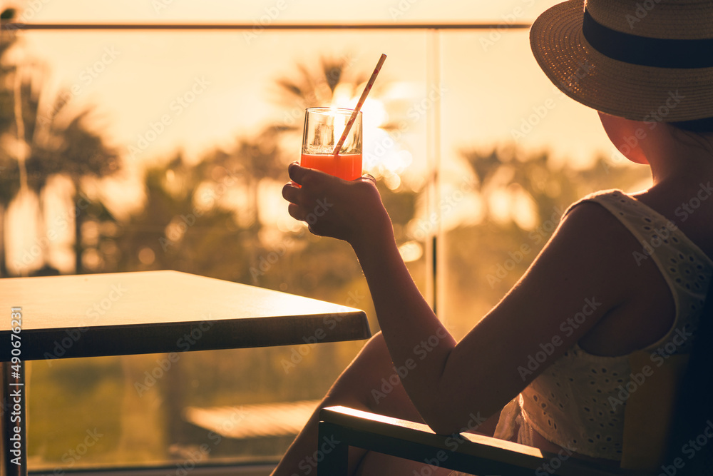 Silhouette of woman in straw hat sitting on the armchair near table on balcony drinking juice and looking on sunset palm sea beach. Rear view