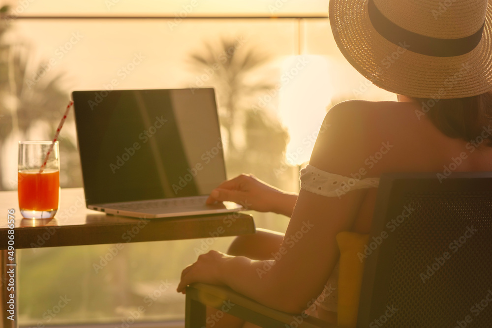 Silhouette of woman freelancer in straw hat drinking juice during working on laptop sitting on the armchair near table on balcony opposite sunset palm sea beach. Remote work on the vacation. Rear view