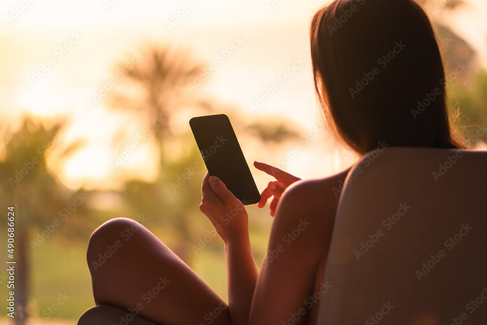Rear view of woman looking at phone sitting on armchair near panoramic window opposite palm trees sea beach at sunset.