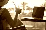Silhouette of woman freelancer in straw hat drinking juice during working on laptop sitting on the armchair near table on balcony opposite sunset palm sea beach. Remote work on the vacation. Rear view