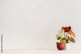Potted plants on the table against bright neutral wall. Stylish interior background.