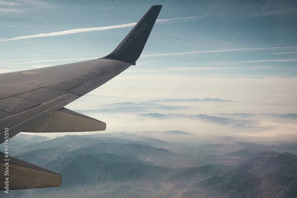 View of mountains from in airplane and airplane wing.