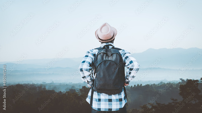 African backpack traveler man looking a sunrise ,fog and landscape on a top of a mountain