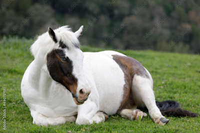 Pinto Horse Resting in the Meadow. Los Altos Hills, California, USA.