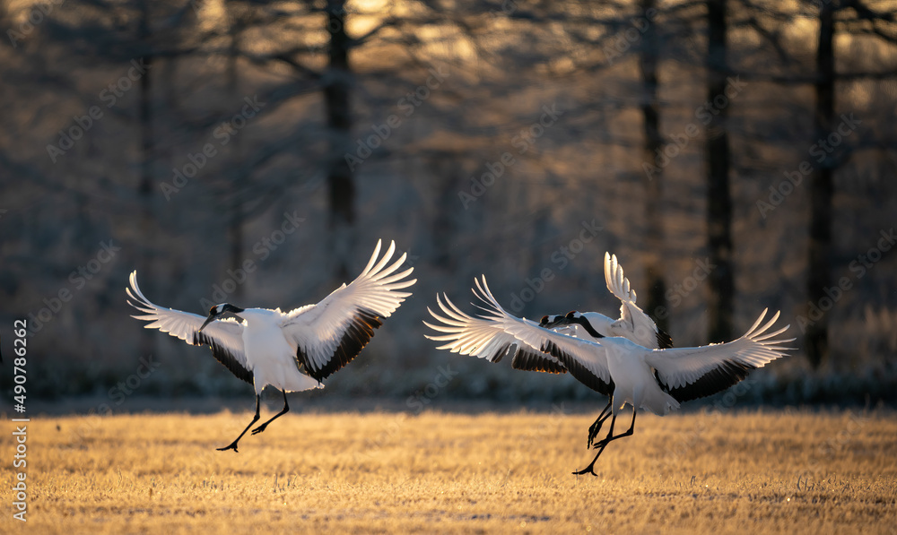 Selective focus shot of three red-crowned cranes flapping their wings in Kushiro national park