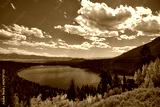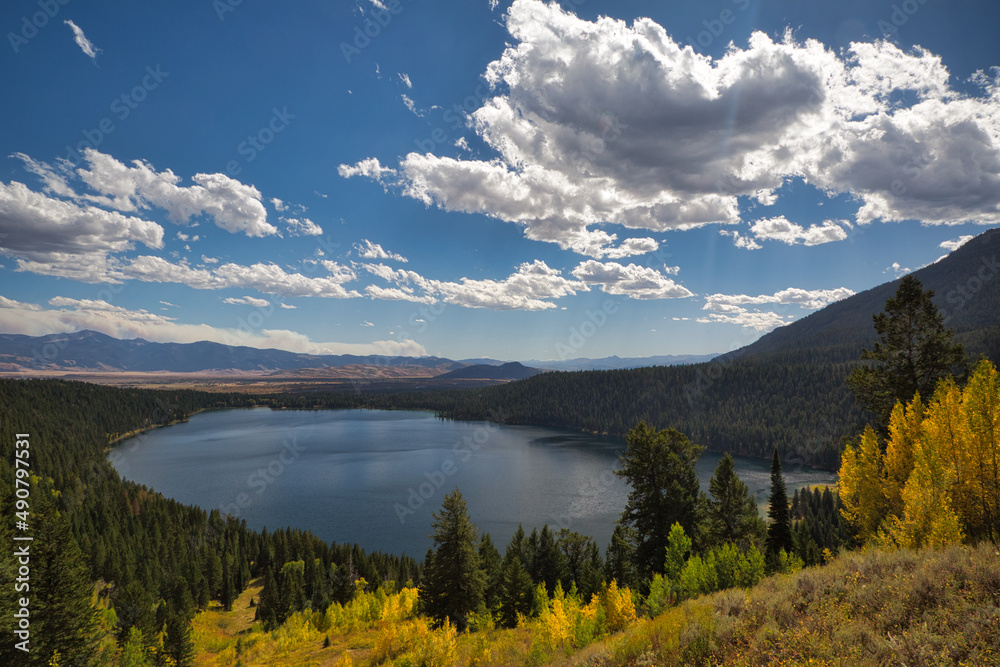 Scenic view of Phelps Lake surrounded by green pine forests in Grand Teton National Park, Wyoming