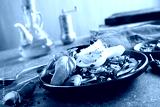 basil leaf, cabbage, corn and boil egg, lime on brown hard gray table texture on background.