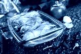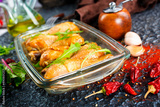 chicken legs baked in with fresh garlic and herbal close-up in a baking dish on the table.