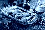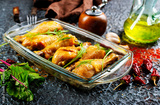 chicken legs baked in with fresh garlic and herbal close-up in a baking dish on the table.