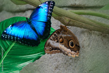 Beautiful closeup of two Peleides blue morpho butterflies, one with open and one with closed wings, Tropical butterfly specie from America