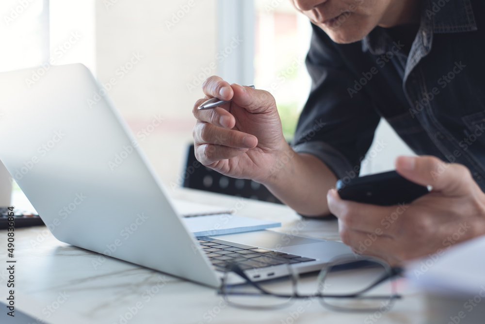 Asian business man working on laptop computer, searching information and using mobile phone at modern office, close up