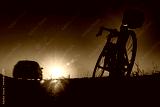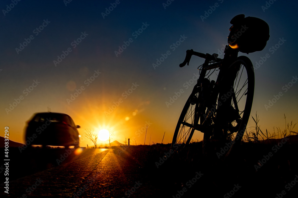 The silhouette of a bicycle with traveling box by the rural road with sunset.