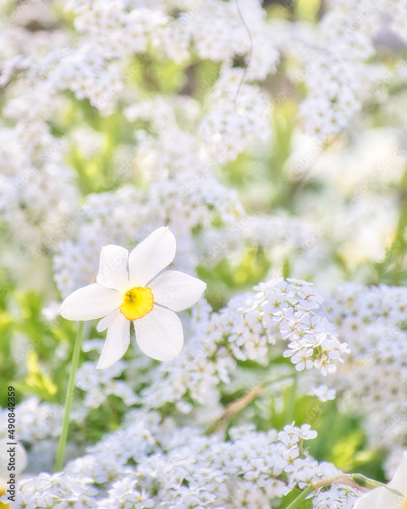 スイセンのクローズアップと可愛いユキヤナギ