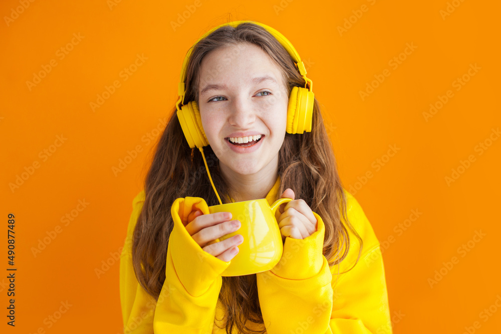 Yong woman girl in yellow hoody and headphones posing isolated on yellow wall