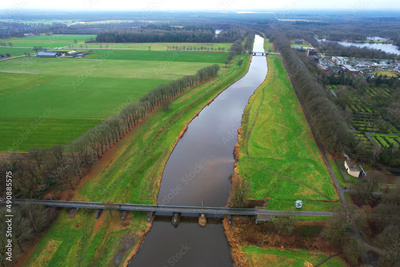 Aerial view of a river flowing the green fields in Waalwijk, the Netherlands