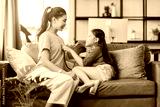 asian daughter play doctor checking up her mother with care and happiness in living room on sofa couch at home,female daughter playroll doctor nurse use stethoscope listen her mom heart pulse with fun