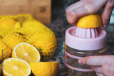 Woman squeezing lemon with juicer. Lemon stack and squeezer on the kitchen countertop background. No sugar or sugar free delicious lemonade preparation process with lots of or many yellow lemons.