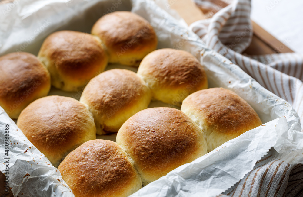 Homemade yeast dinner rolls stuffed with rose jam, close up view