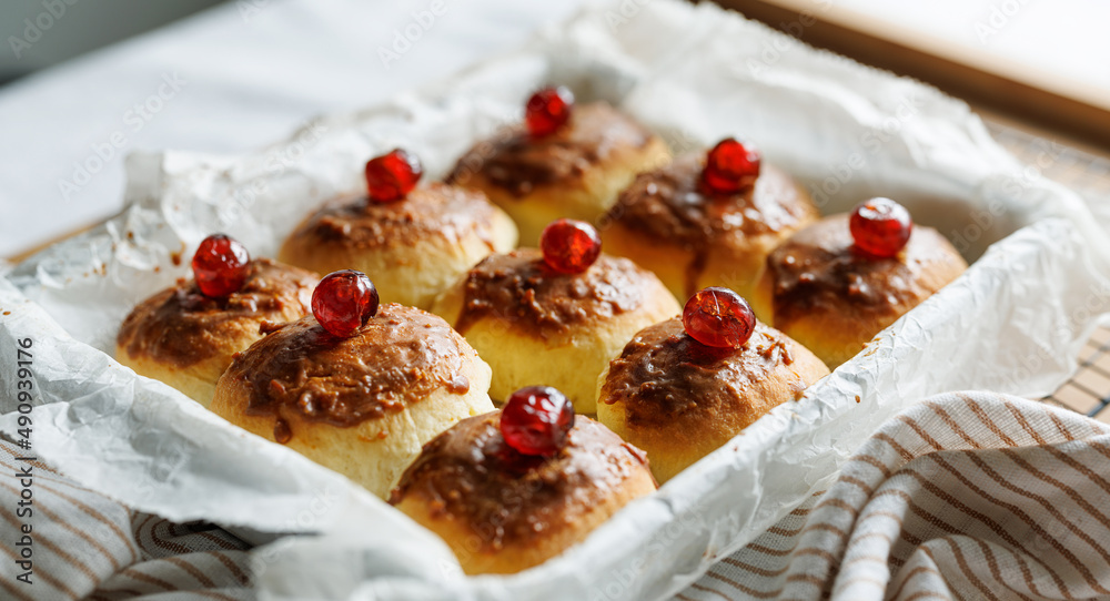 Yeast sweet buns stuffed with fruit preserves and decorated with candied cherries, focus on the roll inside