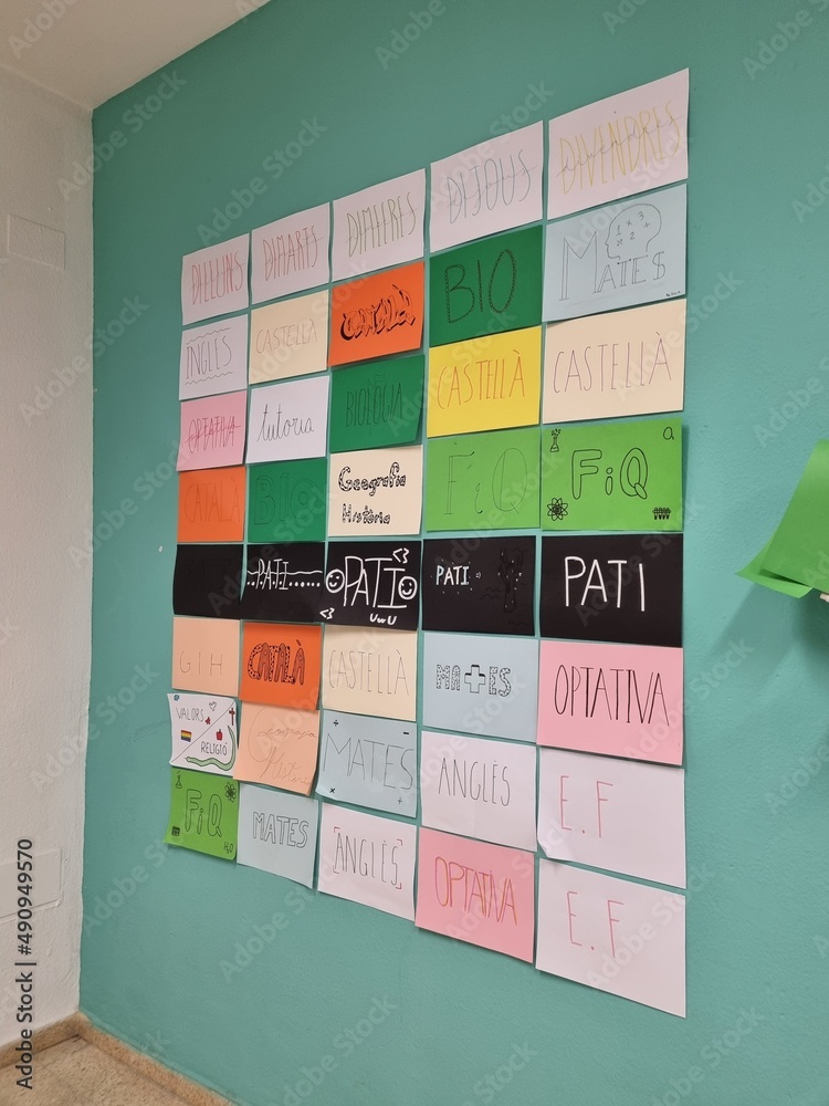 Ibiza, Spain; 2nd March 2022: a big school timetable created by students, written in Catalan and Spanish.