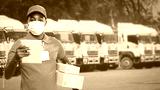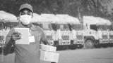 African delivery man with face mask holding a box package and cardboard.Concept of quarantine delivery service