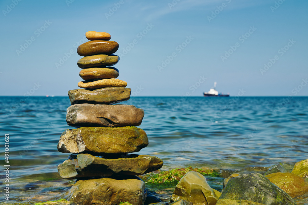 Stone pyramid on a pebble beach. Symbolizes stability and harmony