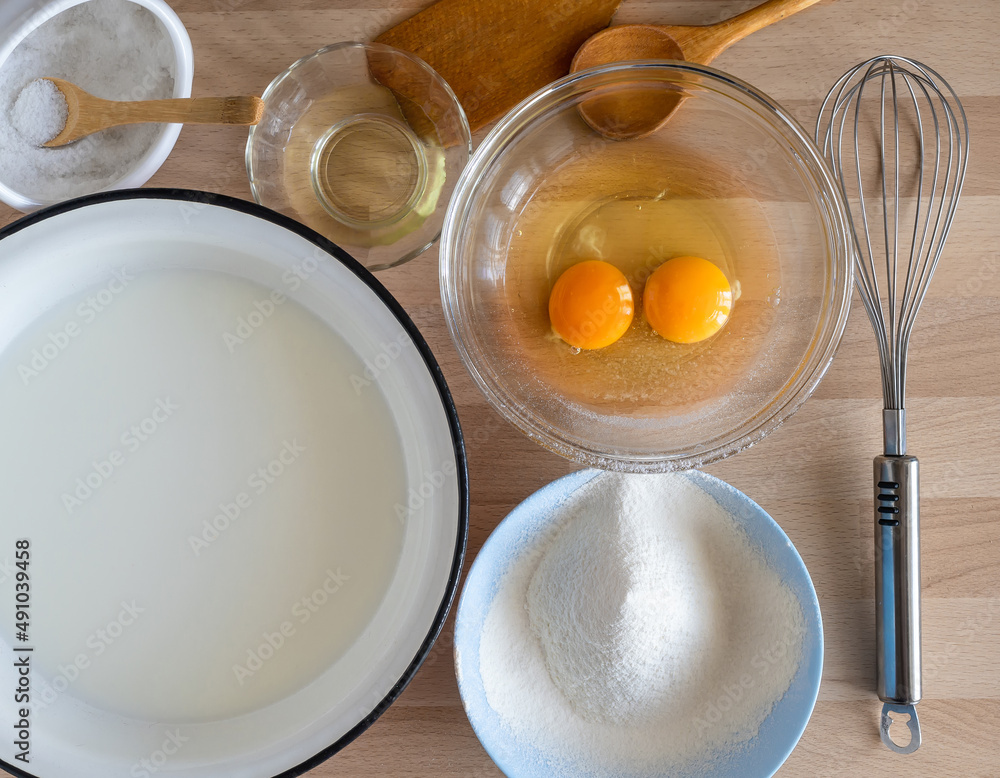 Prepared ingredients for cooking homemade pancakes on the kitchen counter.