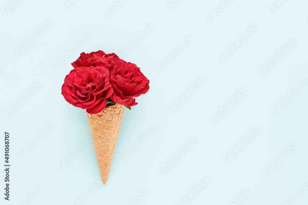 Red roses in ice-cream cone on a light blue background. Summer concept. Copy space