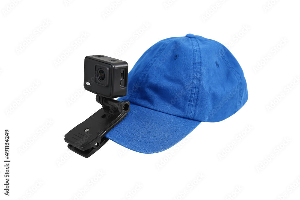 Camera action cam with clip on blue cap or hat isolated on white background with clipping path include for design usage purpose.