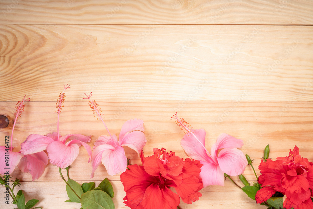 Wooden background with Pink and Red hibiscus flower, Empty wooden background texture surrounded by Pink and Red hibiscus flower.