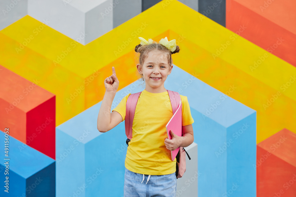 Cute schoolgirl pointing up against colorful wall