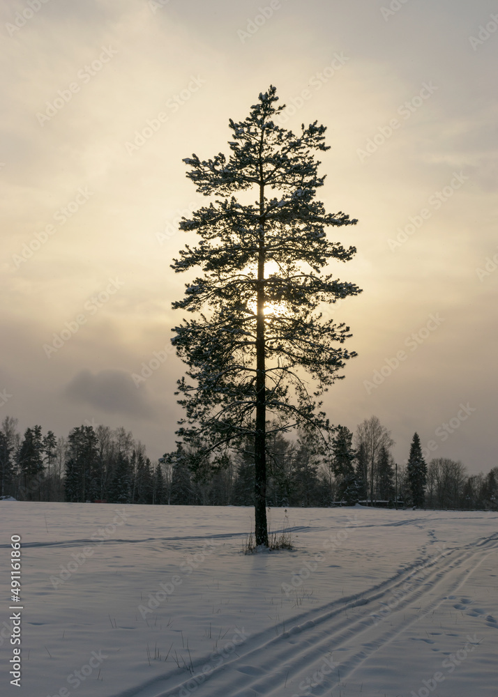 beautiful winter landscape with a lonely tree against the setting sun, the magic of winter