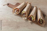 Gyro pita Shawarma wrap on wood table. Greek food with slice cut meat, overhead